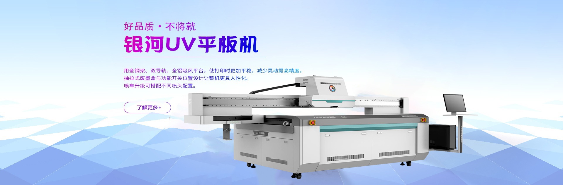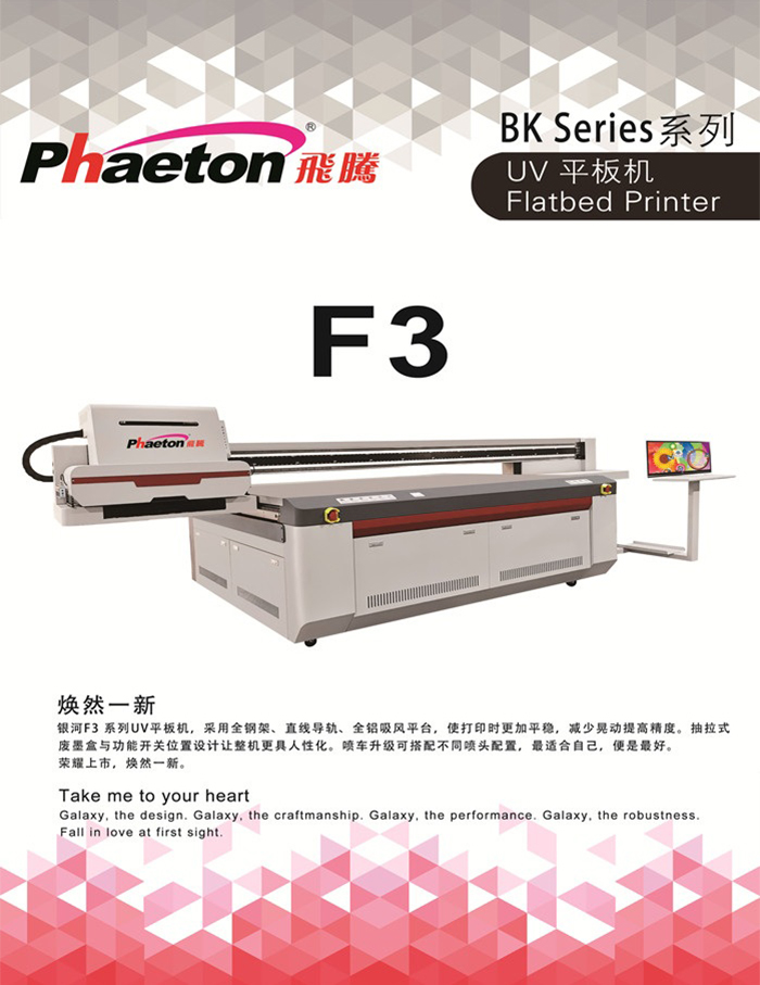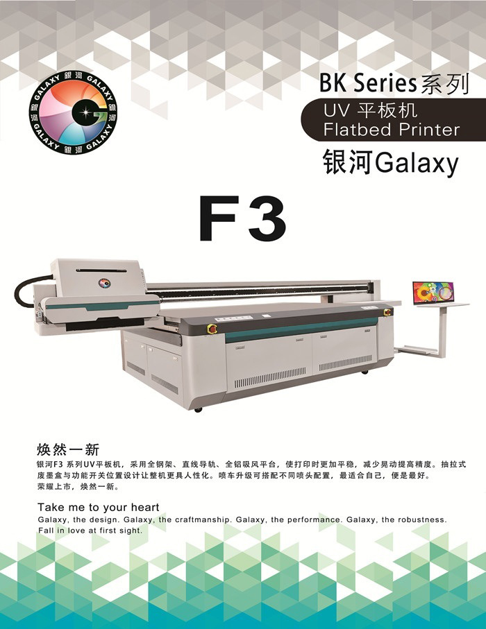 銀河F3系列UV平板機(jī),采用全鋼架、直線導(dǎo)軌、全鋁吸風(fēng)平臺,使打印時更加平穩(wěn),減少晃動提高精度。抽拉式廢墨盒與功能開關(guān)位置設(shè)計(jì)讓整機(jī)更具人性化。噴車升級可搭配不同噴頭配置,最適合自己,便是最好。 榮耀上市,煥然一新。